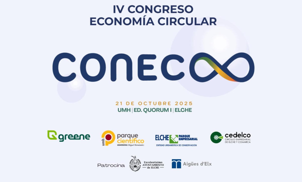 Elche volverá a situarse como referente en innovación y sostenibilidad con la celebración del Congreso de Economía Circular Conecoo, que tendrá lugar el lunes 21 de octubre en las instalaciones del Parque Científico de la Universidad Miguel Hernández (UMH).
