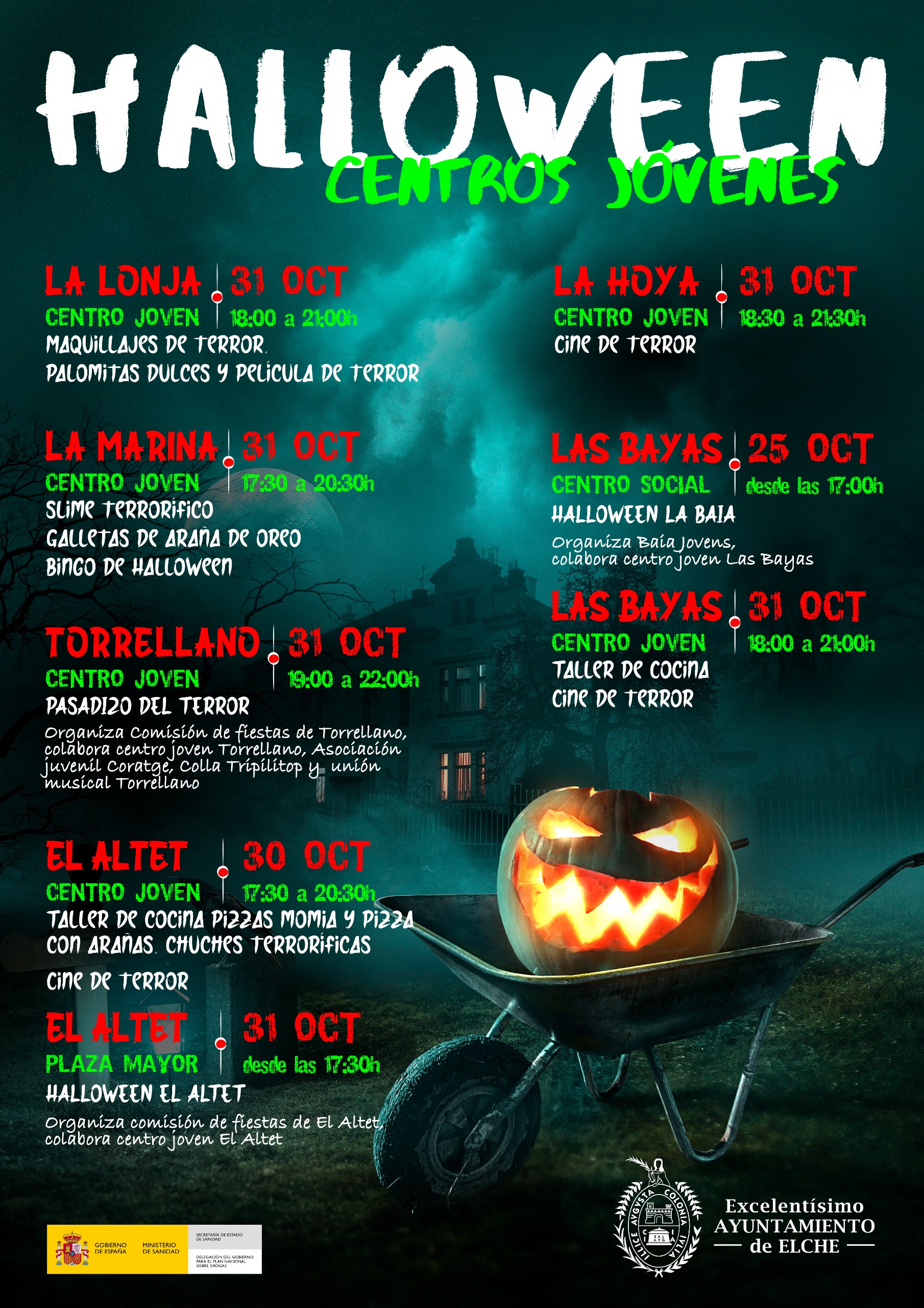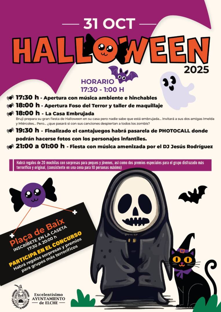 El Ayuntamiento de Elche, a través de las concejalías de Festejos y Juventud, ha presentado una completa programación para la celebración de Halloween el próximo 31 de octubre, con actividades repartidas por todo el término municipal y dirigidas tanto a familias y niños como a jóvenes.