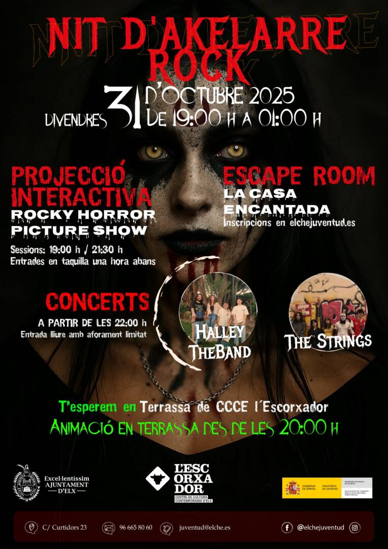 El CCCE Escorxador acogerá el 31 de octubre la película interactiva “The Rocky Horror Picture Show” con dos pases a las 19:00 y 21:30 horas y un Scape Room de La Casa Encantada donde habrá pases cada 30 minutos desde las 19:00 hasta las 00:00 horas. Además, habrá una barra que ofrecerá cócteles sin alcohol, una foodtruck tematizada y como novedad este año, amenizarán la jornada dos bandas de rock integradas por jóvenes ilicitanos: “The Strings” y “Halley Band” que actuarán de 22:00 a 00:30 horas. Para el Scape Room será necesario inscribirse a partir del 25 de octubre.