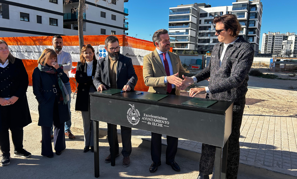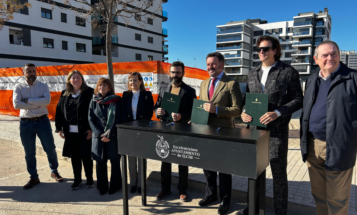El Ayuntamiento de Elche ha dado hoy un paso decisivo para ampliar el parque público de vivienda en alquiler asequible con la firma del acta de replanteo del edificio de 76 viviendas que se construirá en el barrio de Travalón, en la calle Maestro Ángel Llorca. El acto ha contado con la presencia del alcalde, Pablo Ruz, la tercera teniente de alcalde Aurora Rodil, y la edil de Distritos Loli Serna, junto al gerente de PIMESA, Antonio Martínez.
