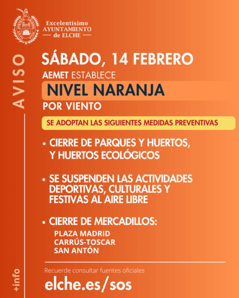 El Ayuntamiento de Elche, en coordinación con la Policía Local, ha determinado el cierre preventivo de todos los parques, huertos y huertos ecológicos del municipio ante la alerta naranja por viento decretada por la Agencia Estatal de Meteorología (AEMET) para mañana sábado 14 de febrero.
