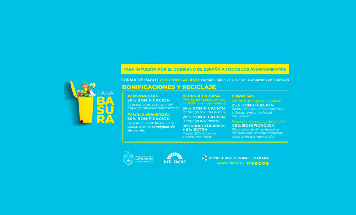 Además, con el objetivo de ayudar a las pequeñas empresas y autónomos, se establece una reducción del 25% de la tarifa con una cifra de negocio anual inferior a 60.000 euros. Puede encontrar toda la información en www.elche.es/tasabasura