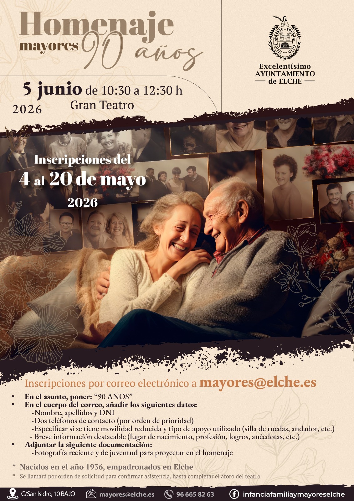 Las inscripciones comienzan el próximo lunes 4 de mayo y estarán abiertas hasta el día 20 de mayo. Los interesados en participar deben haber nacido en el año 1936 y estar empadronados en Elche. De esta forma, deberán enviar un correo electrónico a mayores@elche.es y en el asunto deben poner ’90 años’. Además de añadir una fotografía reciente y de juventud para proyectar el día del homenaje.