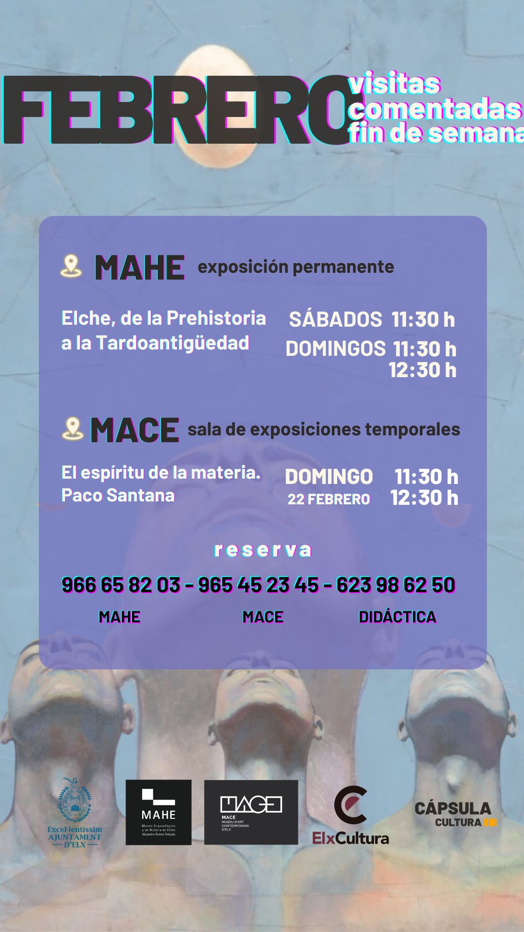 Durante el mes de febrero, el Museo Arqueológico y de Historia de Elche (MAHE) ofrece visitas comentadas de fin de semana a su exposición permanente “Elche, de la Prehistoria a la Tardoantigüedad”. Estas visitas permiten realizar un recorrido guiado por las principales etapas históricas del municipio, desde los primeros asentamientos hasta la época tardoantigua.