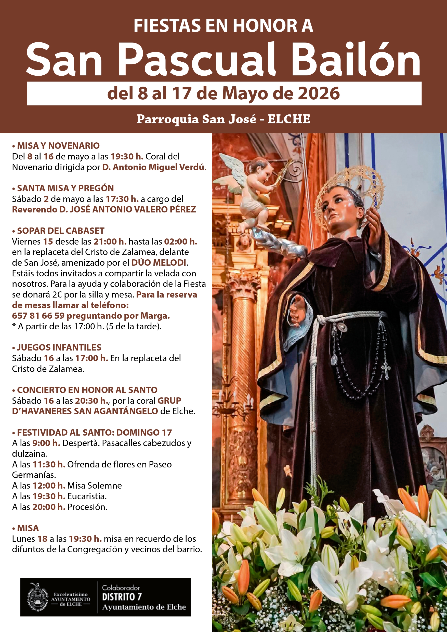 « Todos los Eventos FIESTAS EN HONOR A SAN PASCUAL BAILÓN 8 mayo 2026 al 18 mayo 2026 « JORNADA BIENESTAR INTERIOR FIESTAS EN HONOR A SAN ISIDRO LABRADOR » ORGANIZA: PARROQUIA SAN JOSÉ COLABORA: DISTRITO 7 Añadir al calendario Google Calendar iCalendar Outlook 365 Outlook Live Detalles Comienza: 8 mayo 2026 Finaliza: 18 mayo 2026 Categorías del Evento: Distrito 7, Distritos, Evento