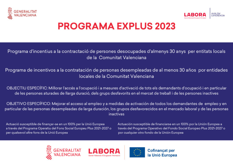 EXPLUS 2023 – PROGRAMA DE SUBVENCIONES DE EMPLEO PARA LA CONTRATACIÓN DE PERSONAS DESEMPLEADAS DE AL MENOS 30 AÑOS DE EDAD POR ENTIDADES LOCALES DE LA COMUNITAT VALENCIANA (AVALEM EXPERIÈNCIA).