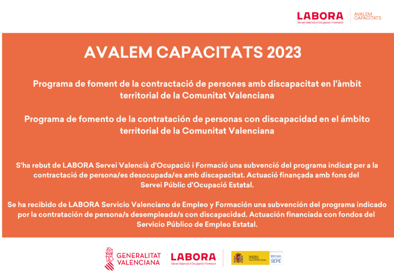 EMDISC 2023 – PROGRAMA DE SUBVENCIONES INICIATIVA SOCIAL, DESTINADAS A LA CONTRATACIÓN DE PERSONAL DESEMPLEADAS CON DISCAPACIDAD EN COLABORACIÓN CON CORPORACIONES LOCALES (AVALEM CAPACITATS).