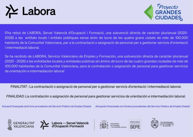 Subvención directa de carácter plurianual (2025-2028) a las entidades locales y entidades públicas sin ánimo de lucro de las cuatro grandes ciudades de más de 100.000 habitantes de la Comunitat Valenciana, para la contratación o asignación de personal para gestionar servicios de orientación e intermediación laboral.
