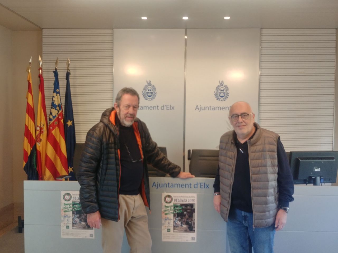 El regidor de Festes, José Pérez, juntament amb el vicepresident de l’Associació de Betlemistes d’Elx, Bernardo Román, han explicat les característiques principals que tindrà el Betlem de Nadal, que s’inaugurarà en la Glorieta el pròxim 8 de desembre.