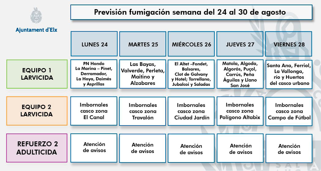 La Regidoria de Sanitat de l’Ajuntament d’Elx i l’empresa de control de plagues CTL centraran aquesta setmana els treballs de fumigació contra els mosquits en l’erradicació de les larves en les zones on es desenvolupen. Per a això, els equips de l’empresa contractada recorreran totes les pedanies il·licitanes i desinsectaran els embornals del nucli urbà de la ciutat.
