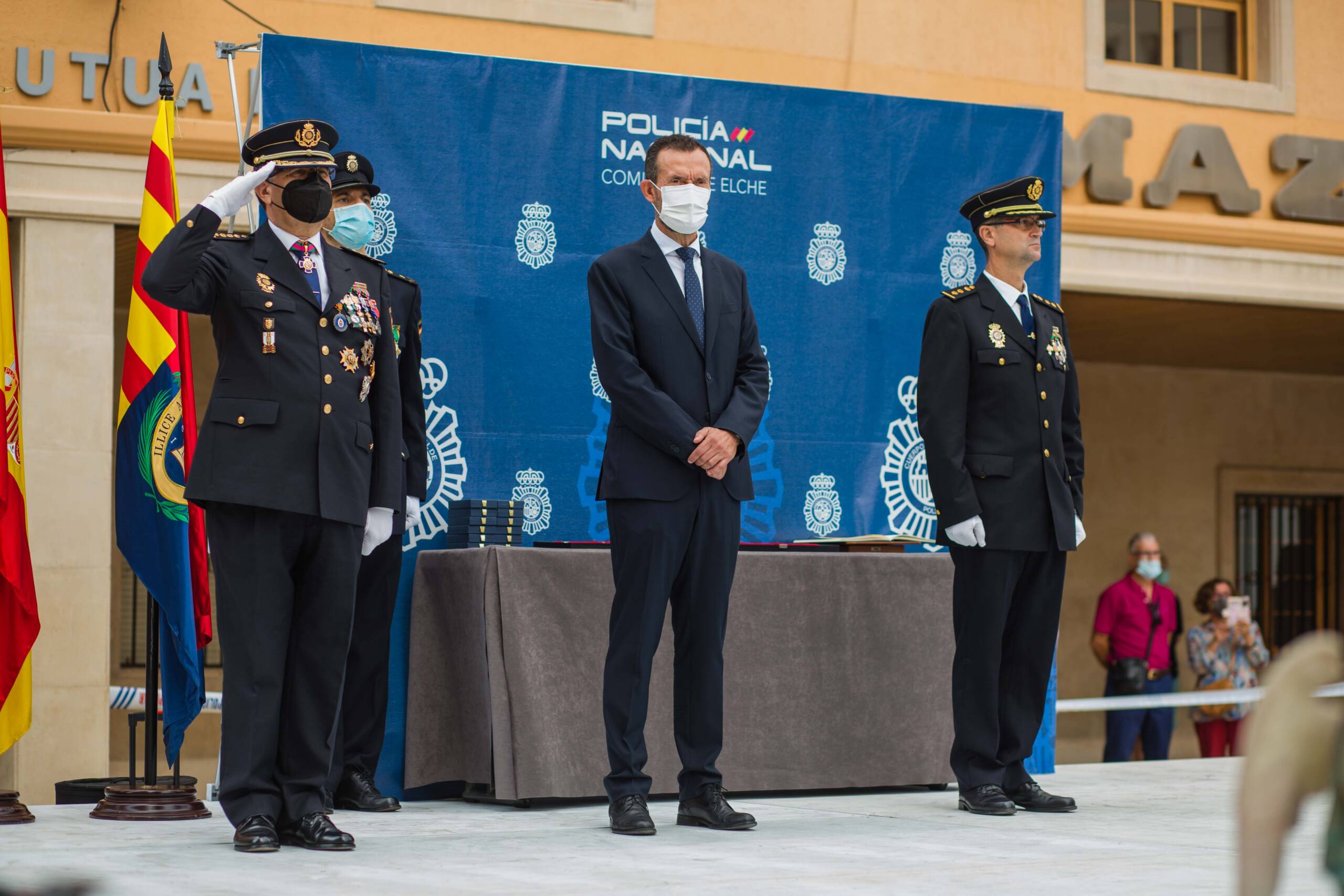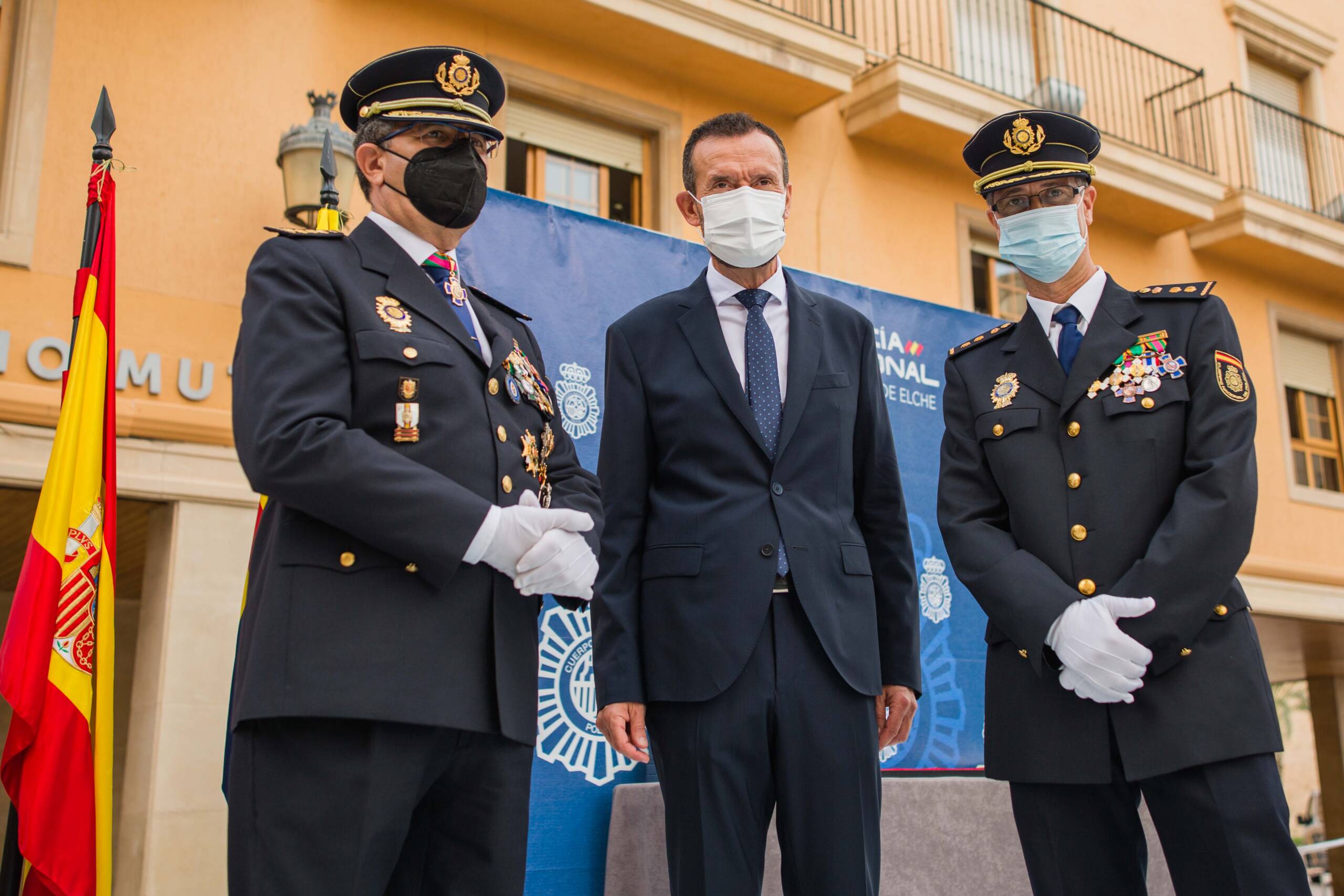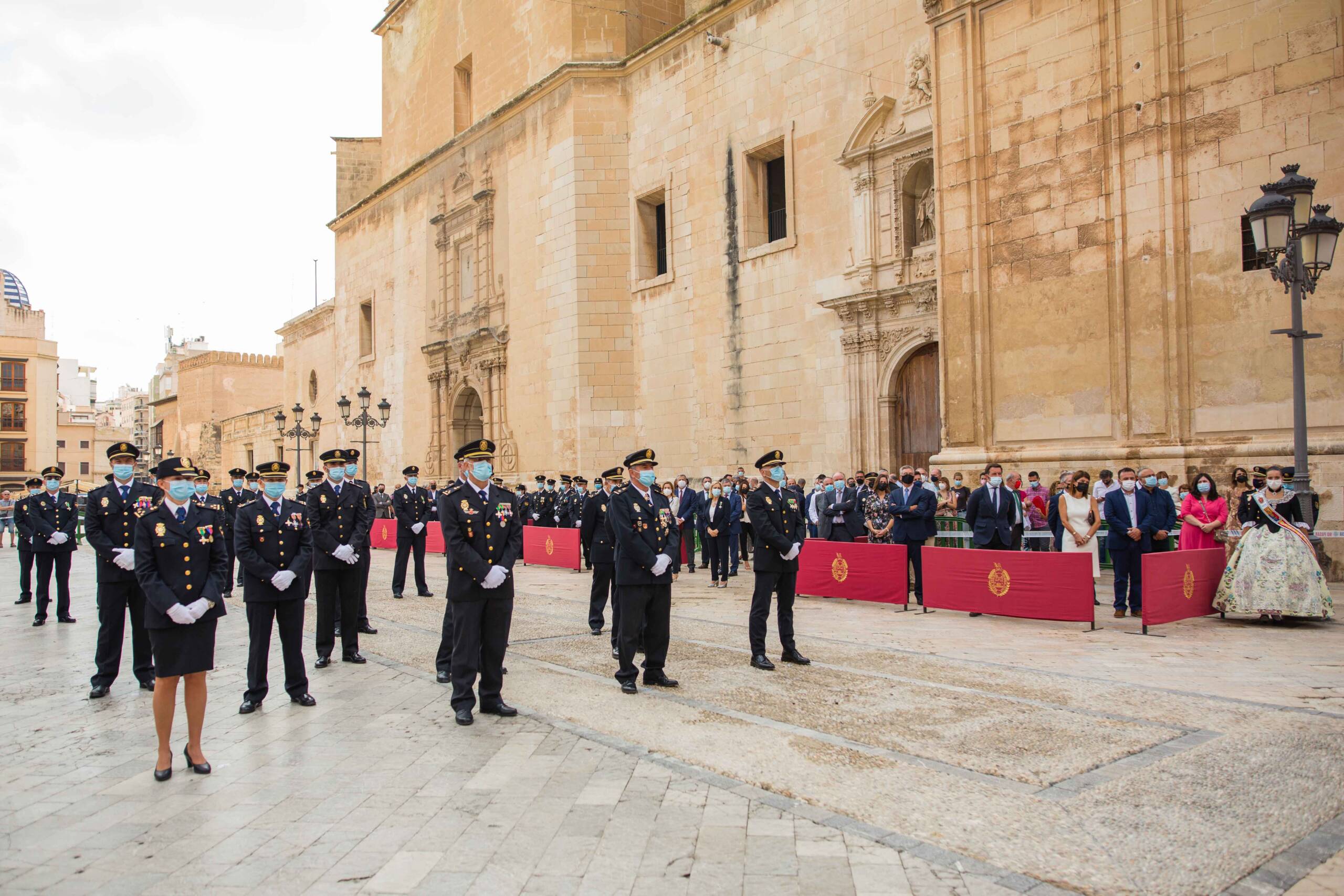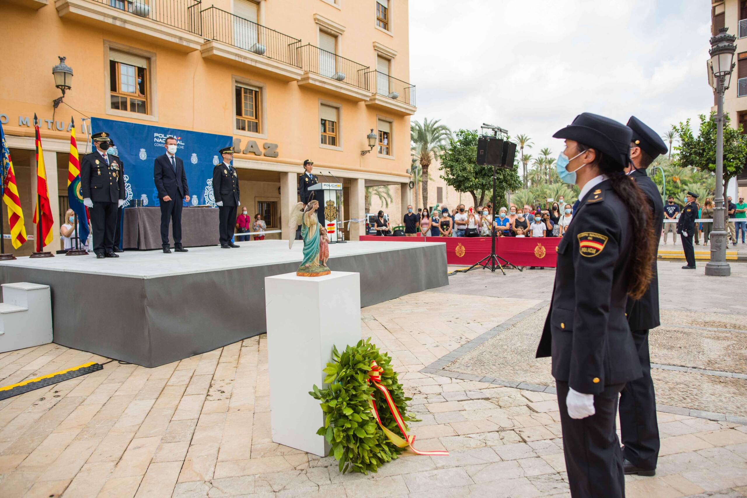 La plaça del Congrés Eucarístic ha sigut escenari aquest matí de la celebració del patró del Cos Nacional de Policia (CNP), Sants Àngels Custodis. L’esdeveniment, presidit per l’alcalde d’Elx, Carlos González, i el comissari cap de la Comissaria de la Policia Nacional a la ciutat, Pedro Montore, acompanyats pel regidor de Seguretat Ciutadana, Ramón Abad, i el cap de la Policia Local d’Elx, César Zaragoza, ha despertat l’interés de la ciutadania i ha congregat a l’espai públic a nombroses autoritats civils –entre aquestes, membres de l’Equip de Govern i de la Corporació Municipal–, policials i castrenses en un acte que no se celebrava des de 2019 per motius pandèmics.