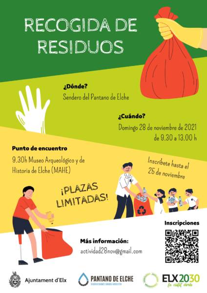 L’Ajuntament, a través de la Regidoria de Medi Ambient, ha organitzat per al pròxim 28 de novembre, de 9.30 a 13.00 hores, una jornada de sensibilització sobre residus a la senda del Pantà d’Elx amb motiu de la Setmana Europea de la Prevenció de Residus.