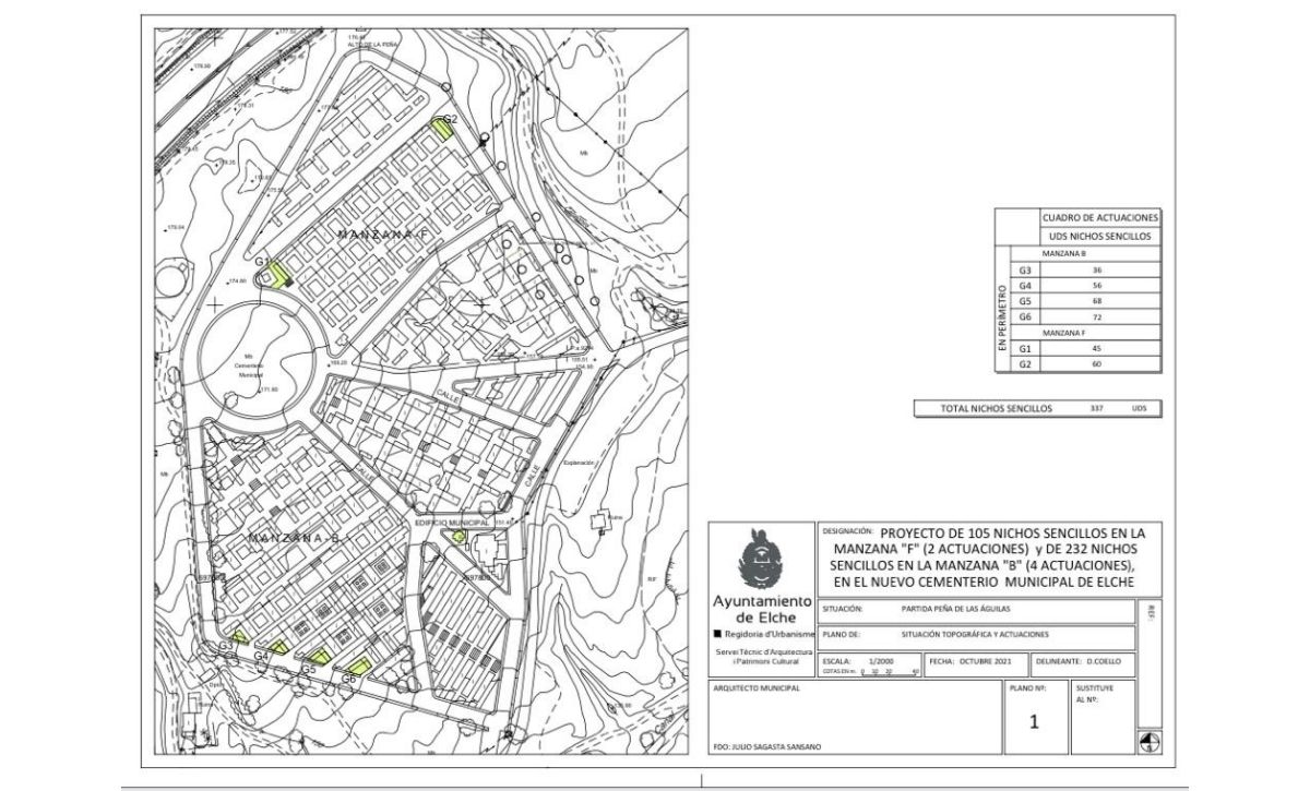 L’Ajuntament d’Elx invertirà 316.000 euros en la construcció de 337 nínxols individuals en el Cementeri Nou. La Junta de Govern Local ha aprovat aquest matí el projecte i l’inici de la licitació, que inclou la impermeabilització de la coberta i la millora de l’immoble que acull l’oficina del cementeri i la reparació del bloc de nínxols transversal 21, danyat fa uns mesos per un accident de trànsit.