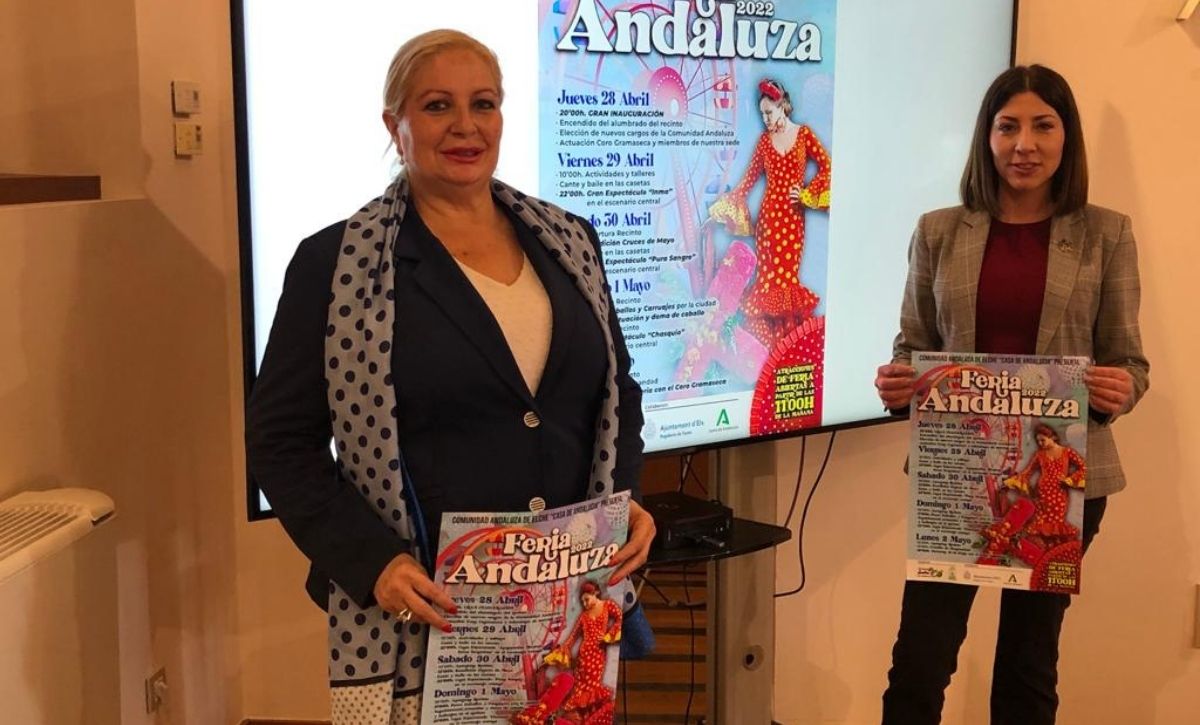 La regidora de Festes, Mariola Galiana, i la presidenta de Casa d’Andalusia, Ángeles Masegosa, han presentat la Fira Andalusa 2022, la inauguració de la qual tindrà lloc al Passeig de l’Estació el dijous 28 d’abril, a les 20.00 hores, amb l’encesa de l’enllumenat del recinte, l’elecció dels nous càrrecs de la Comunitat Andalusa i l’actuació del Cor Gramaseca i membres del col·lectiu andalús d’Elx, que porta assentat al municipi des de fa més de set dècades.