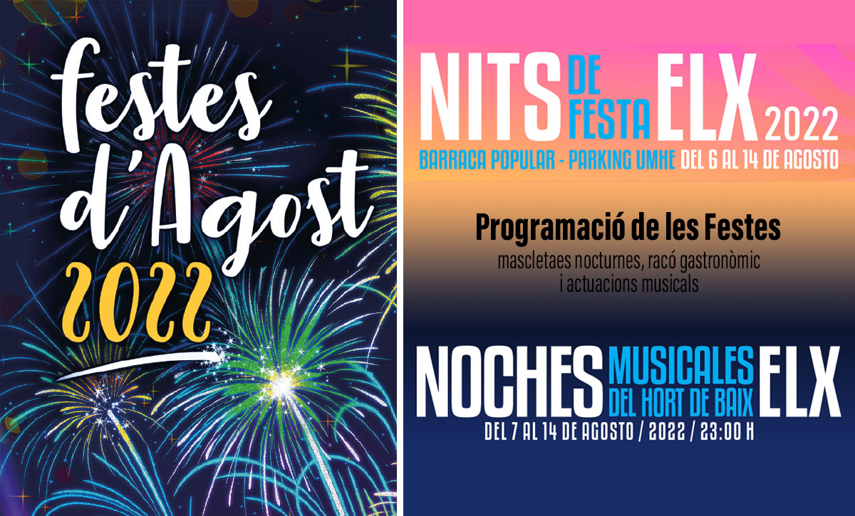 – FestiElx: dissabte 6 i diumenge 7 de 21.00 a 05.00 hores; dilluns 8 i dimarts 9 de 12 a 17 hores i de 21.00 a 00.00 hores