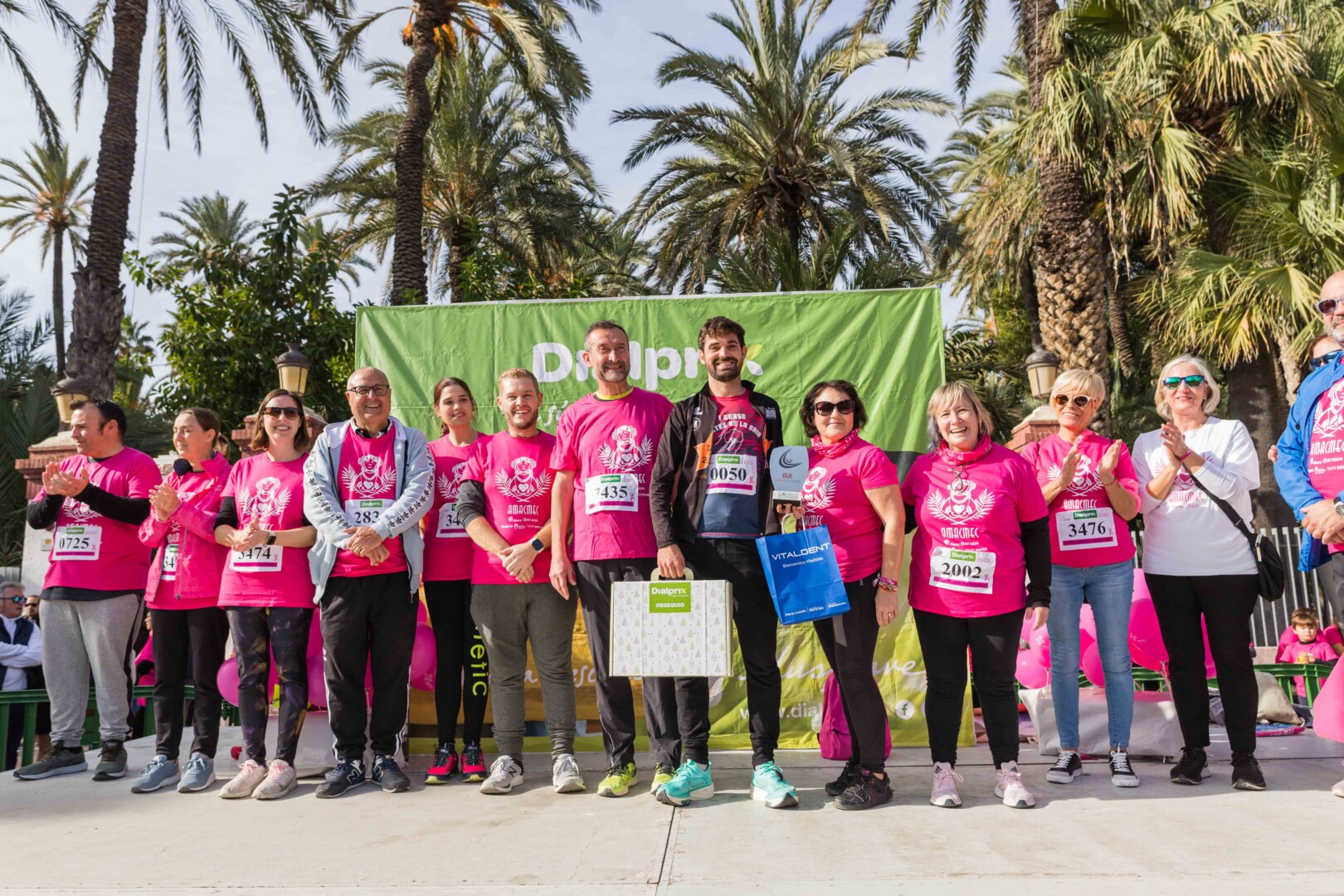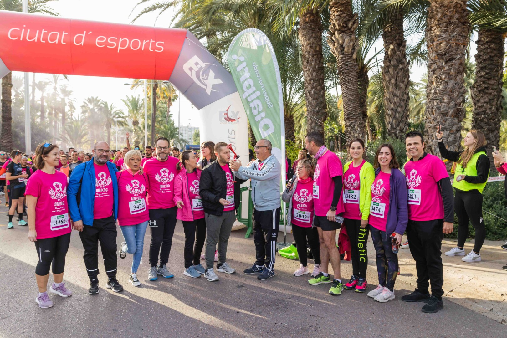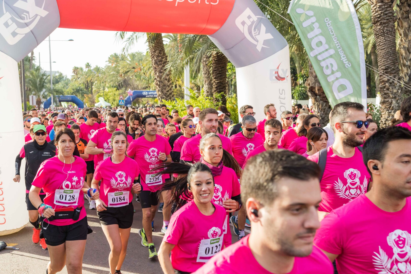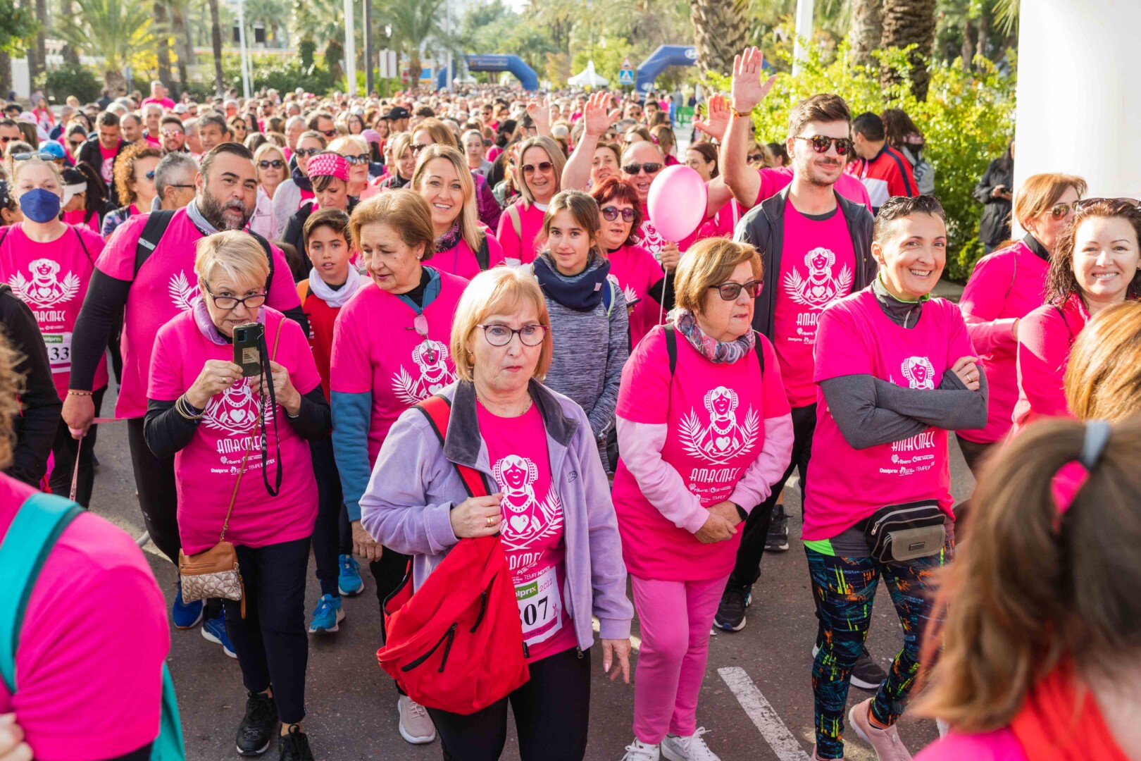Més de 8.000 persones han participat en la XVIII Carrera Contra el Càncer de Mama, organitzada per l’Associació de Dones Afectades per Càncer de Mama d’Elx i Comarca (AMACMEC). Una assenyalada trobada en la qual els participants han lluït per primera vegada la samarreta que commemora el 125 aniversari del descobriment de la Dama d’Elx amb la qual s’han tenyit de rosa els carrers il·licitans durant tot el matí. L’alcalde, Carlos González, el regidor d’Esports, Vicente Alberola, i membres de l’Equip de Govern, així com la presidenta d’AMACMEC, Manuela Agulló, han donat el tret d’eixida des del Passeig de l’Estació, on també ha sigut l’arribada a meta i on s’han instal·lat punts d’avituallament, estands d’Amacmec o de l’hospital del Vinalopó i el servei de fisioteràpia de la universitat CEU Elx.