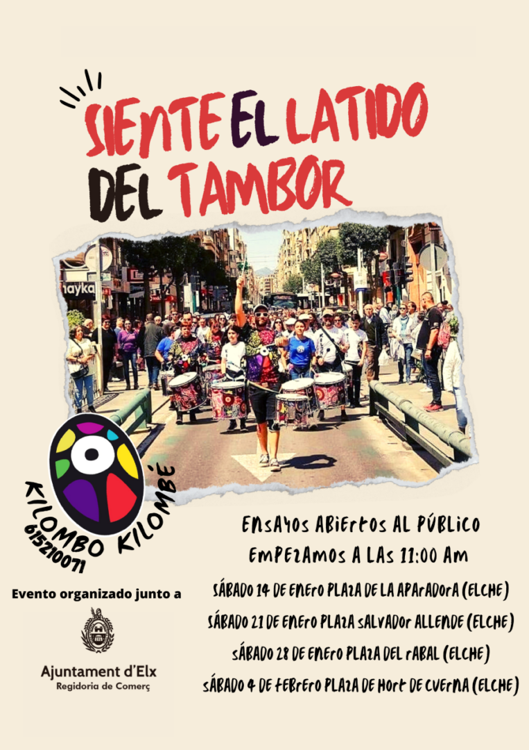 L’agrupació musical Kilombo Kilombé, en col·laboració amb la Regidoria de Comerç, omplirà de ritme diverses zones comercials d’Elx amb assajos de batucada oberts al públic que es realitzaran els dissabtes de gener i el primer del mes de febrer als diferents barris de la ciutat.