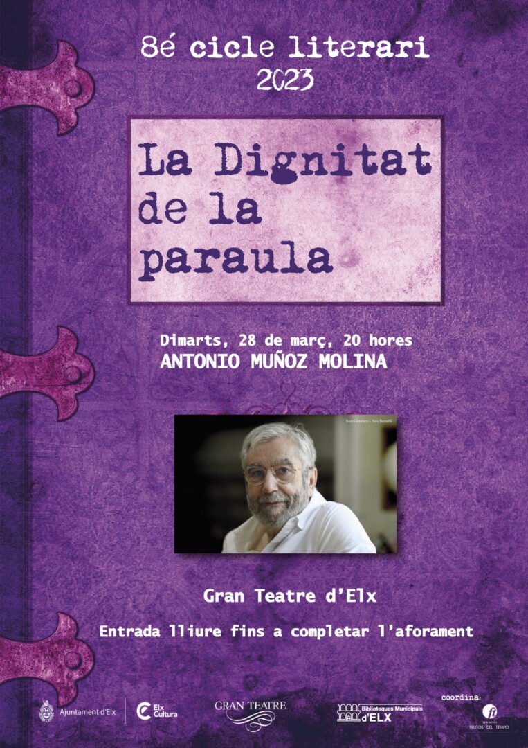 El prestigiós escriptor Antonio Muñoz Molina inaugurarà el dimarts 28 de març la huitena edició de la Dignitat de la Paraula amb una conferència al Gran Teatre d’Elx a partir de les 20.00 hores. Una nova edició que organitza la Regidoria de Cultura amb la col·laboració de l’associació cultural Frutos del tiempo. L’entrada és gratuïta fins a completar aforament.