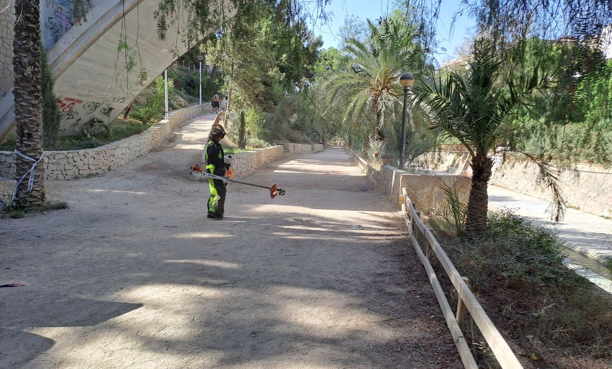 Les brigades municipals han iniciat aquests dies els treballs de desbrossament del vessant del riu Vinalopó. Una actuació que es du a terme per motius de seguretat i per a evitar possibles incendis a causa de les altes temperatures i la celebració aquest diumenge de la tradicional Nit de l’Albà. Unes labors que se centren principalment en zones crítiques com ara l’entorn del mercat centrat provisional i la vall trenada.