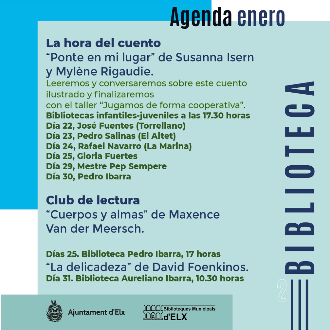 Per als més xicotets, a partir del 22 de gener, s’ha organitzat ‘L’Hora del Conte’, una activitat en la qual es llegirà el conte Ponte en mi lugar de Susanna Isern i Mylène Rigaudie, es conversarà sobre aquest conte il·lustrat i es finalitzarà amb un taller ‘Juguem de manera cooperativa’. L’activitat començarà a les 17.30 hores el dia 22 a la Biblioteca José Fuentes de Torrellano. L’endemà, a la mateixa hora, tindrà lloc a la Biblioteca Pedro Salinas de l’Altet. El dia 24 es farà a la Biblioteca Rafael Navarro de la Marina, el 25 a la Biblioteca Gloria Fuertes, el 29 a la Mestre Pepe Sempere i el dia 30 en la Pere Ibarra.