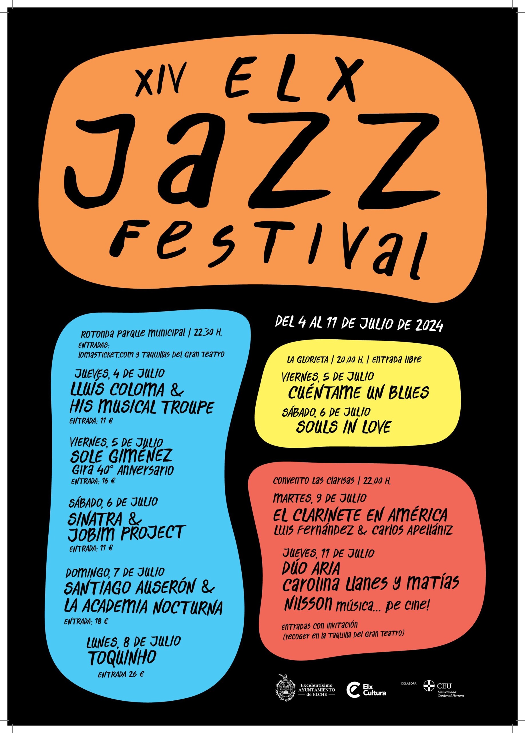 La Rotonda del Parc Municipal acull des del dijous 4 de juliol el XIV Elx Jazz Festival, amb actuacions destacades com la de Sole Giménez, vocalista de Presuntos Implicados, en el marc del seu Gira 40 Aniversari que serà el divendres 5 de juliol a les 22:30 h.