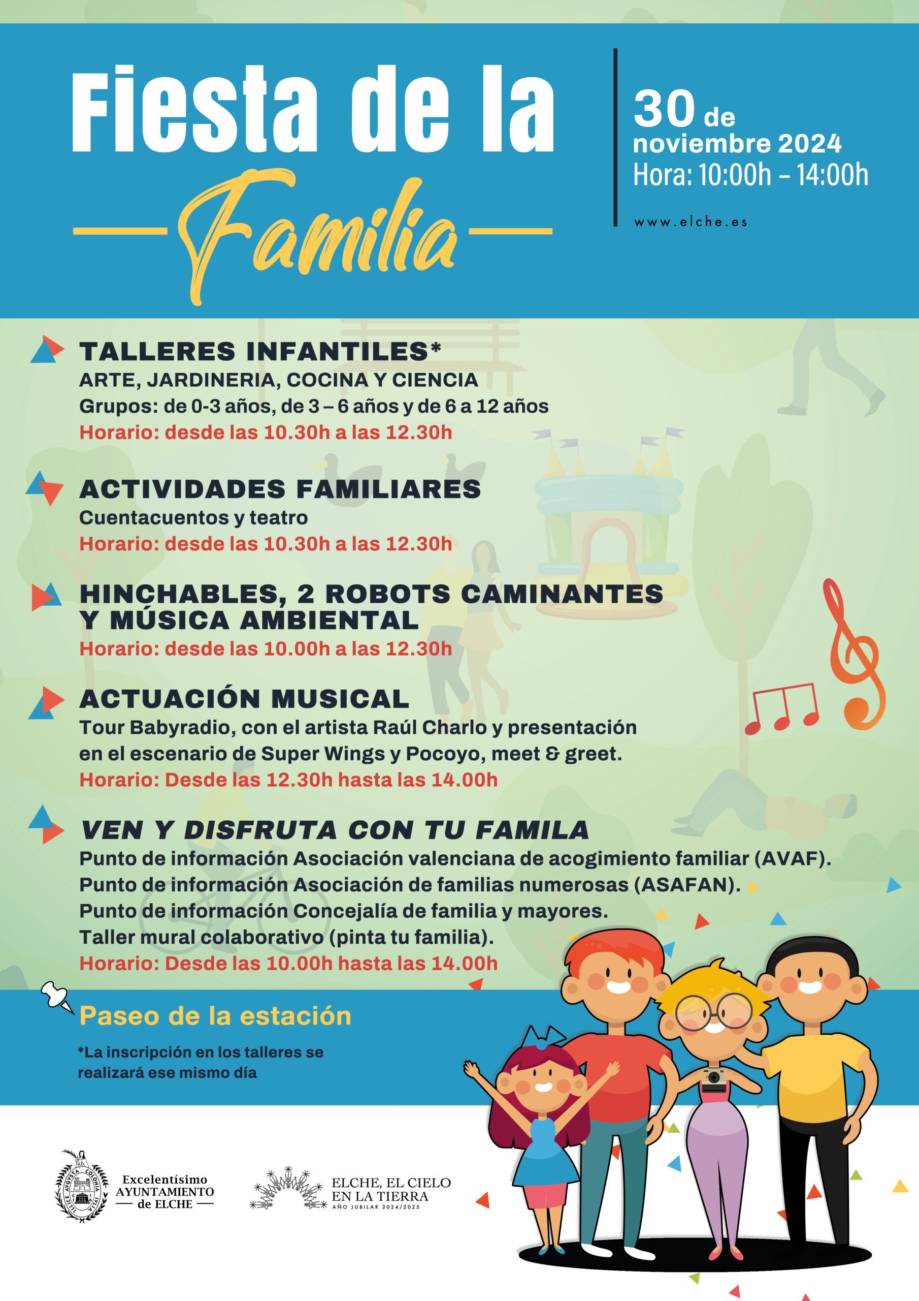 A més, hi haurà inflables, 2 robots caminants, música ambiental, una actuació musical de Tour Babyradio, punts d’informació de l’associació valenciana d’acolliment familiar (AVAF), associació de famílies nombroses (ASAFAN) que realitzarà un taller de xapes i de la Regidoria de Família i Majors, i un mural col·laboratiu.