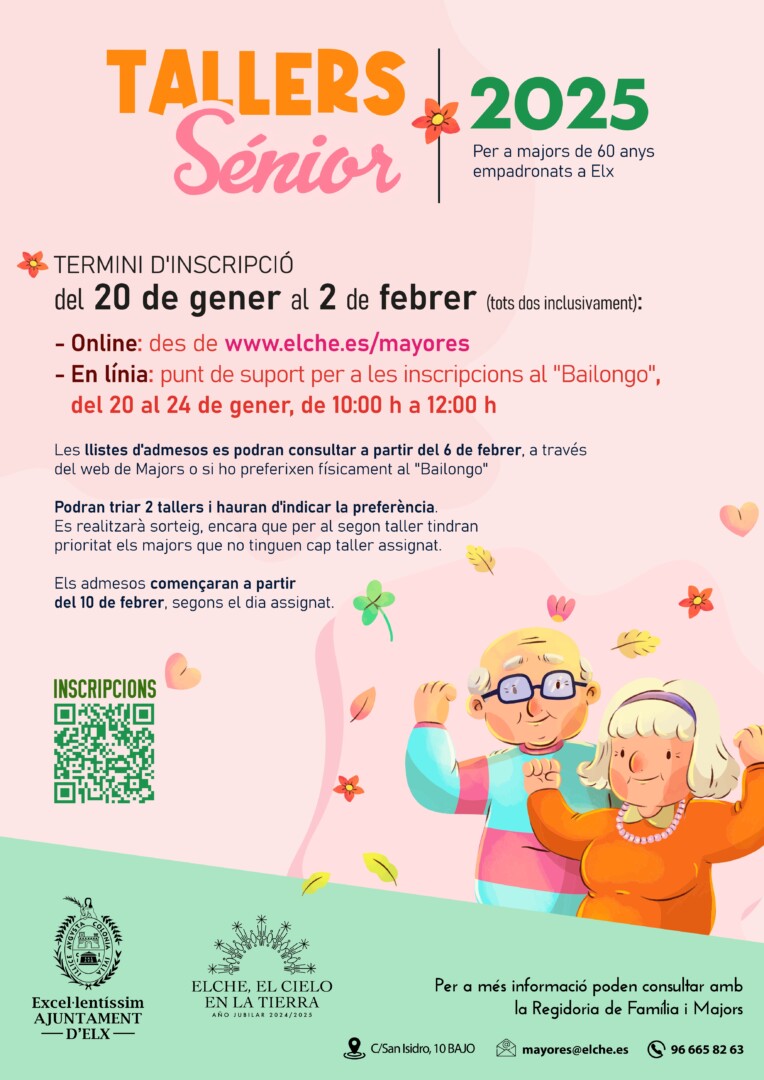 Els cursos començaran el 10 de febrer i tots aquells majors que desitgen participar hauran d’inscriure’s a partir del dilluns, 20 de gener fins al 2 de febrer de 2025. La inscripció podran fer-la emplenant un formulari a través de la pàgina web www.elche.es/mayores o de manera presencial al Centre Cívic del Candalix en horari de 10.00 a 12.00 hores des del 20 fins al 24 de gener.