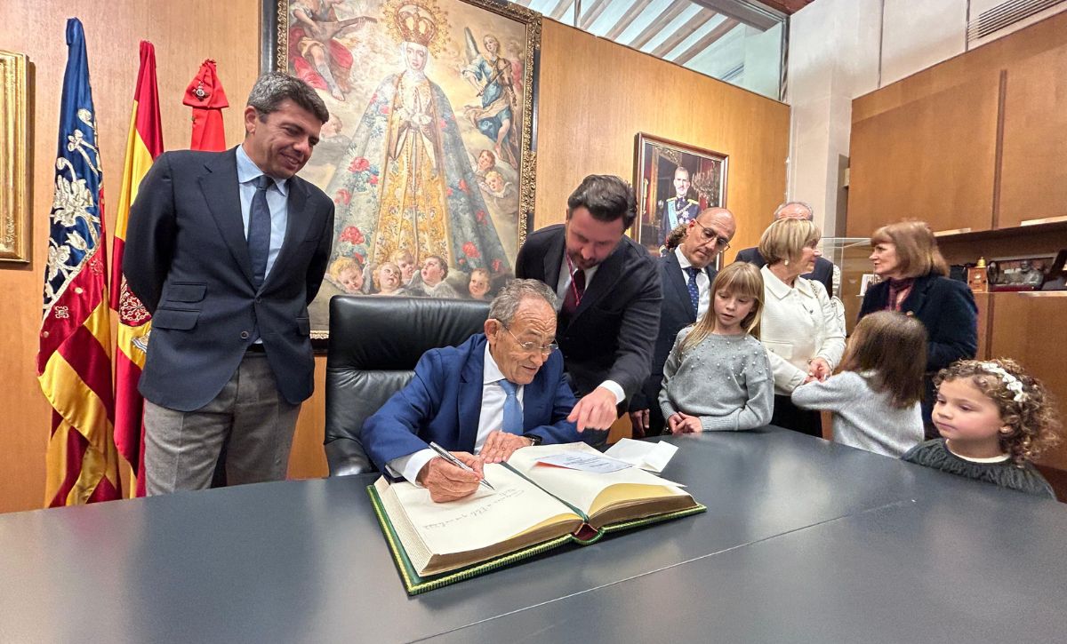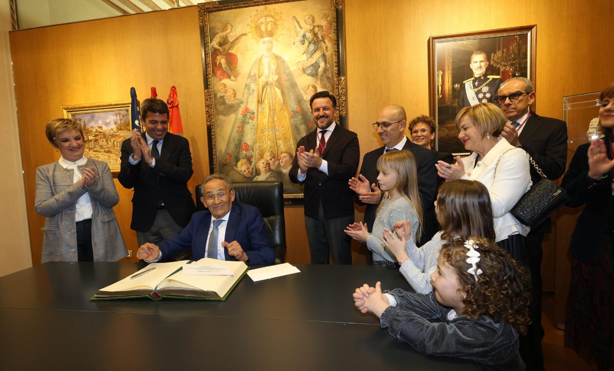 Abans de l’acte de nomenament de Fill Adoptiu d’Elx, Juan Perán ha firmat al llibre d’honor de la ciutat en companyia de la seua família; la corporació municipal; l’alcalde d’Elx, Pablo Ruz; el president de la Generalitat, Carlos Mazón i la consellera d’Innovació, Indústria, Comerç i Turisme, Marian Cano.