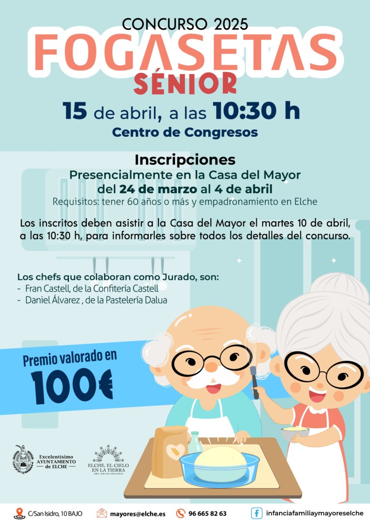 L’Ajuntament d’Elx, a través de l’àrea de Família, Infància i Majors, ha posat en marxa, per segona vegada, el concurs de fogassetes sénior per a posar en valor un dolç que es consumix tradicionalment per Setmana Santa. El certamen tindrà lloc el dia 15 d’abril a les 10.30 hores al Centre de Congressos d’Elx.