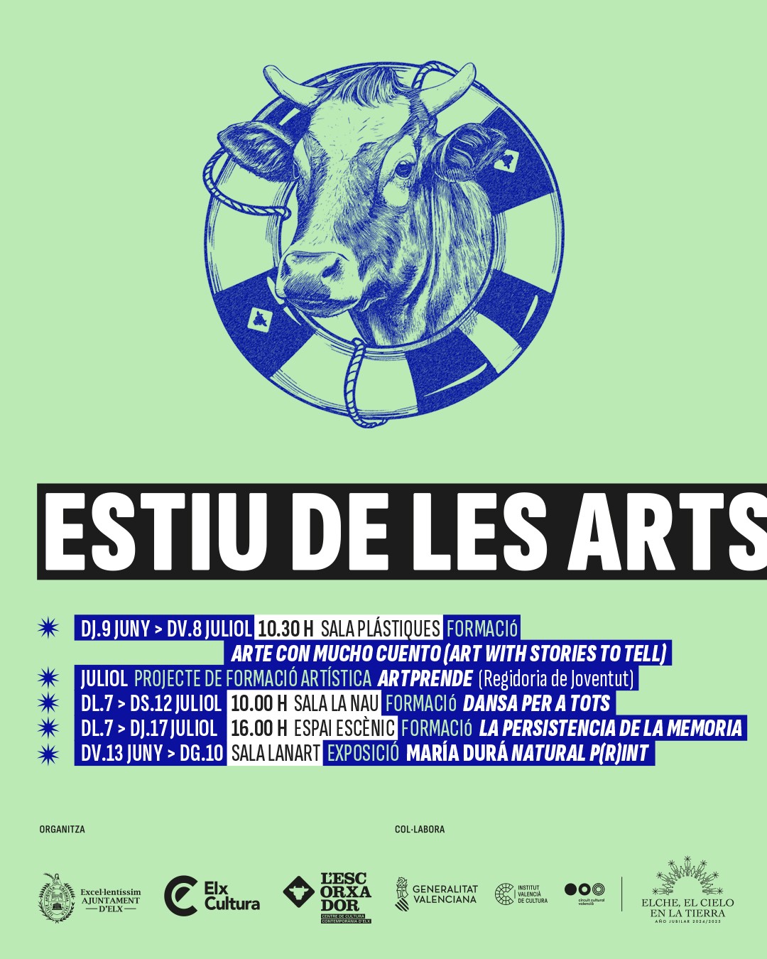 La programació comptarà, com en anys anteriors, amb l’escola artística bilingüe per a xiquets “Art amb molt de conte”; amb la formació per a professionals “La persistència de la memòria” a càrrec de Paco Macià de la Companyia Ferroviària; amb la formació en dansa contemporània d’Asun Noales “Dansa per a tots”; amb el projecte de formació artística per a joves de la Regidoria de Joventut “Aprén” i amb l’exposició de dos mesos de María Durá titulada Natural P(r)int.