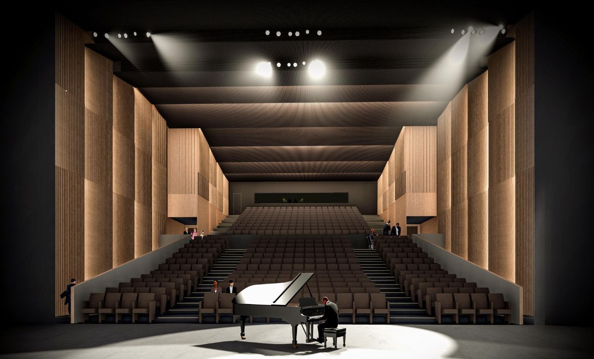 L’edifici proposat es distribueix en dos volums separats: el que agrupa el teatre-auditori, de forma rectangular, centrat al nord de la parcel·la, i l’edifici administratiu en bloc lineal de tres plantes, amb oficines a la primera i segona planta i sala multiús a la planta baixa.