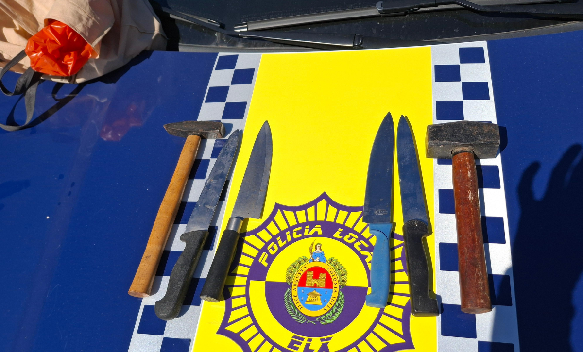 En el moment del registre superficial, es va trobar en poder del detingut una bossa amb un martell, una maça i quatre ganivets. Posteriorment, el detingut, de 77 anys, va ser traslladat a un centre mèdic per a la seua valoració i, posteriorment, a dependències policials per a ser posat a disposició judicial.