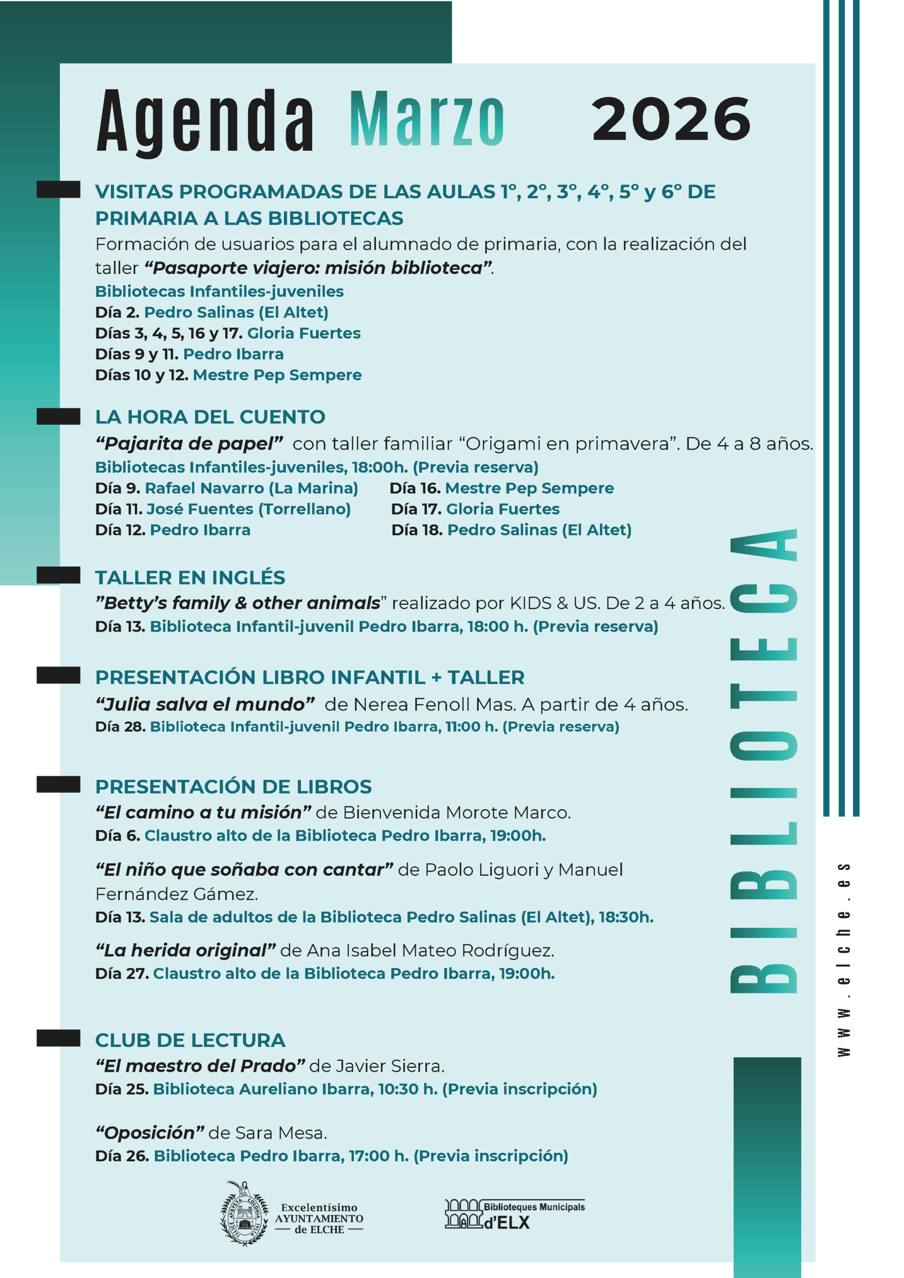 Entre les propostes es troba l’activitat “L’hora del Conte” denominada ‘Corbatí de paper’ acompanyada del taller familiar ‘Origami a la primavera’, que recorrerà diverses biblioteques infantils-juvenils al llarg del mes, a les 18.00 hores, i amb reserva prèvia. Esta activitat passa per les biblioteques Gloria Fuertes, José Fuentes de Torrellano, Rafael Navarro de la Marina, Mestre Pep Sempere, Pedro Salinas de l’Altet i Pere Ibarra.