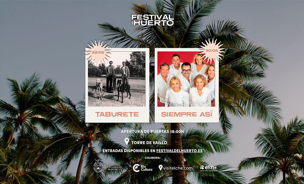 Elx acollirà els pròxims 29 i 30 de maig la primera edició del Festival de l’Hort, una nova cita cultural que tindrà la Torre dels Vaïllo com a escenari principal i que destaca per comptar amb dos grans noms del panorama musical nacional com són Taburete i Siempre Así.