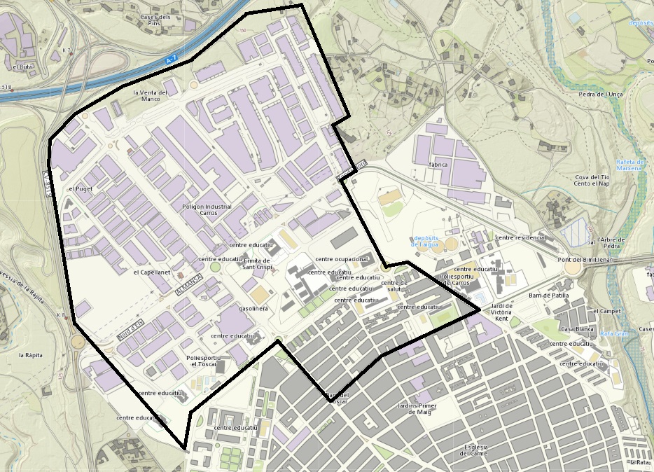 El polígon industrial de Carrús, al nord del barri, va anar ocupant-se en els anys 80 i 90 del segle XX encara que el primer projecte del Pla Parcial era de 1972 i perseguia dotar de sòl al puixant sector del calçat així com “descongestionar el nucli urbà de la ciutat” d’indústries. El polígon amb el pas dels anys ha anat donant cabuda a una varietat d’empreses relacionades amb el comerç i els serveis així com a centres dotacionals.