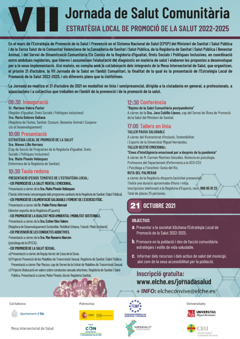 En el marc de l’Estratègia de Promoció de la Salut i Prevenció en el Sistema Nacional de Salut (EPSP) i la Xarxa Salut de la Comunitat Valenciana, el Servei de Dinamització Comunitària Elx Conviu de la Regidoria d’Igualtat, Drets Socials i Polítiques Inclusives, en coordinació i en col·laboració amb els integrants de la Mesa Intersectorial de Salut presenta la VII Jornada de Salut en l’àmbit Comunitari, la principal finalitat de la qual és la presentació de l’Estratègia Local de Promoció de la Salut 2022-2025.