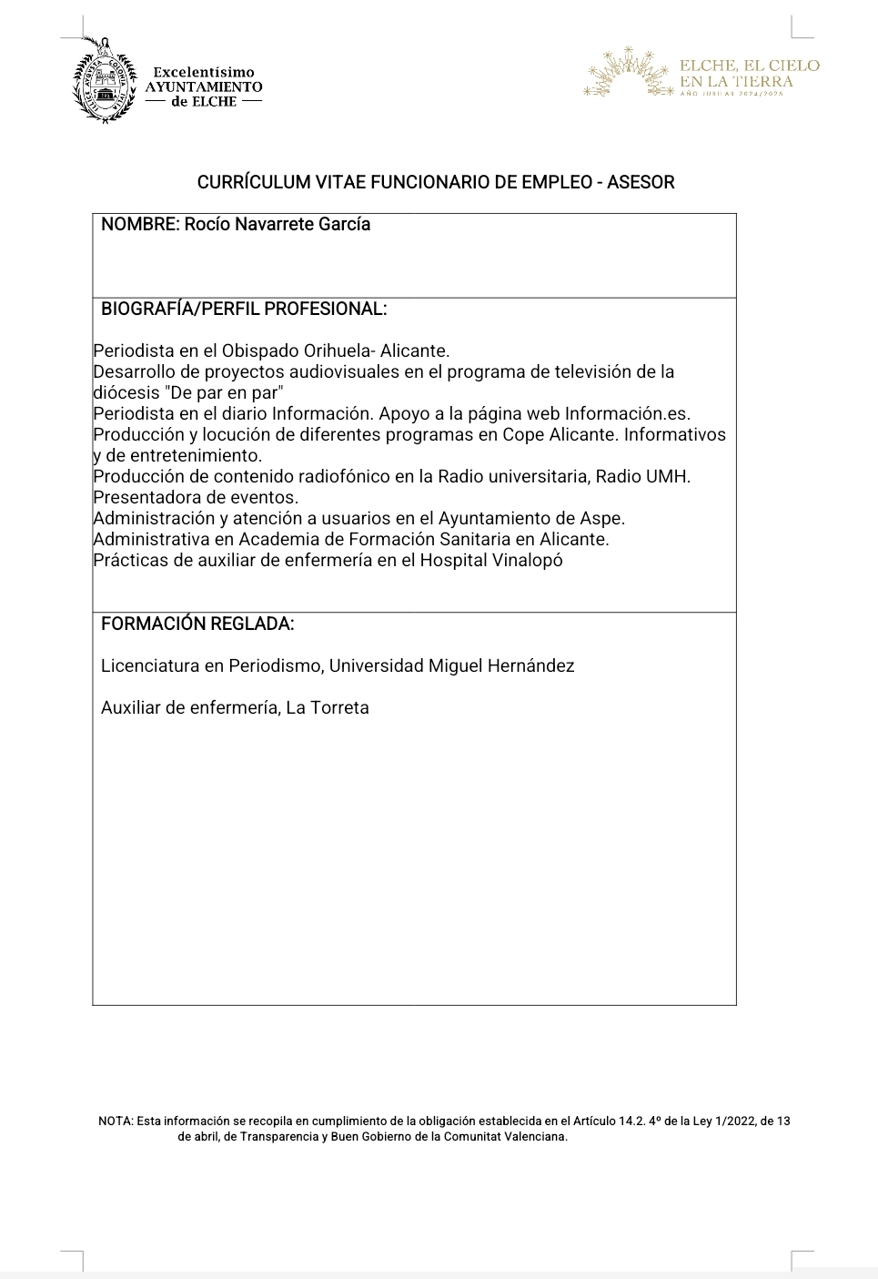 | 15 | Andrea Casado Ballester | A2 | Técnico de Protocolo | Alcaldía ‐ Protocolo |